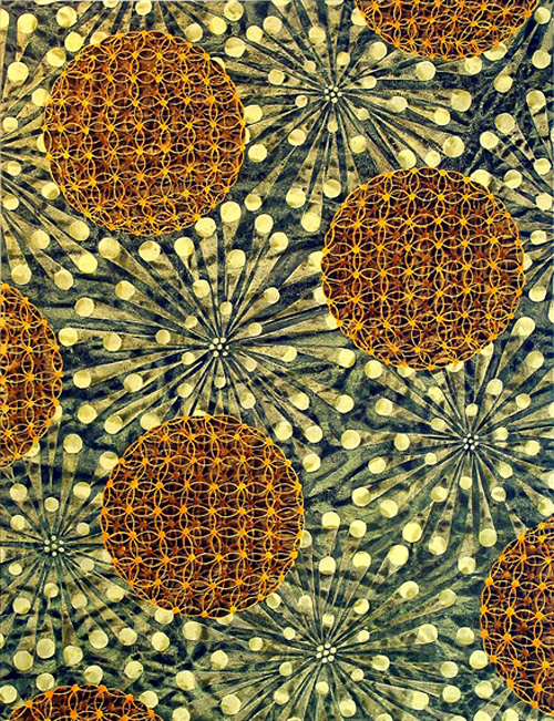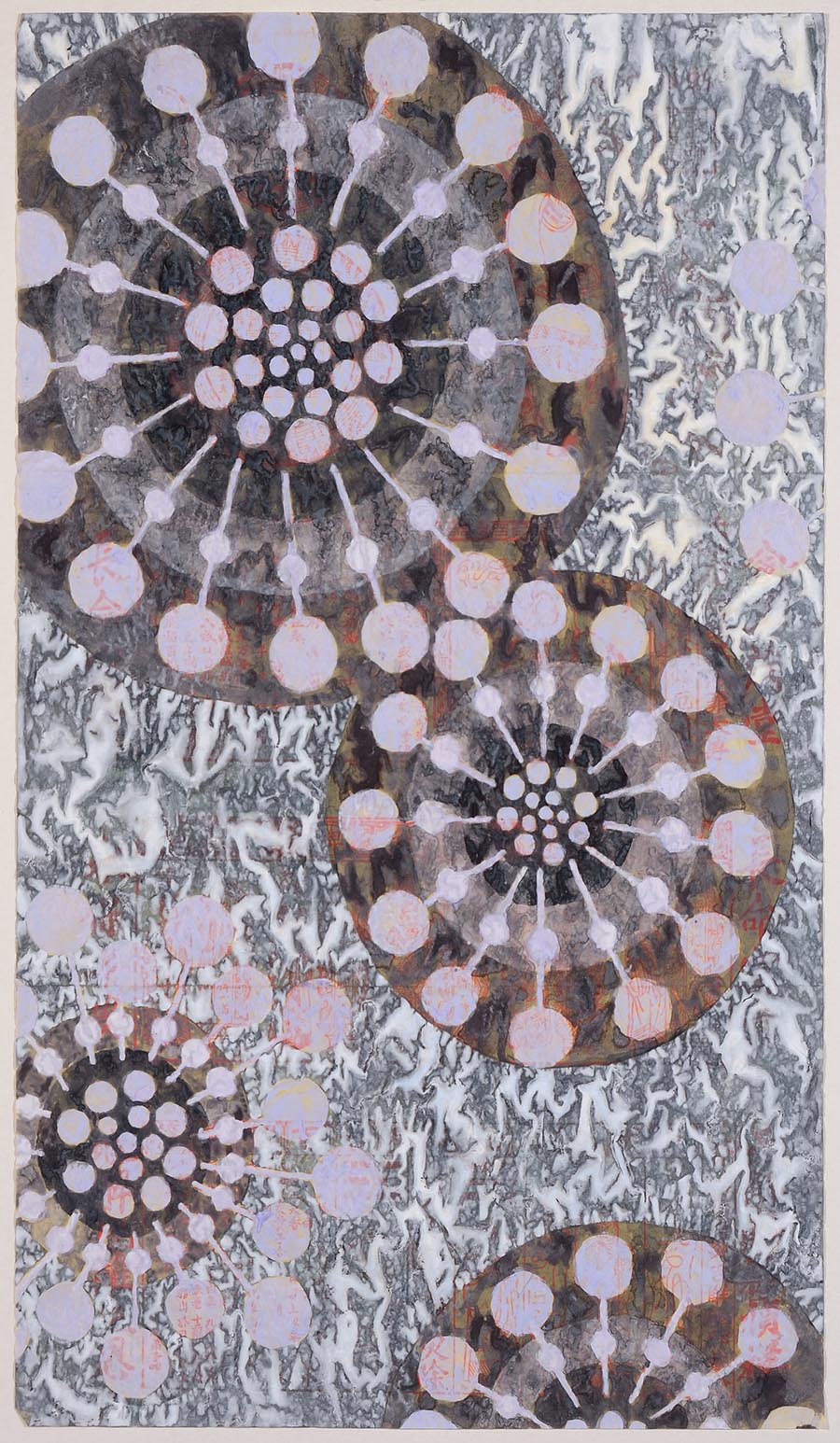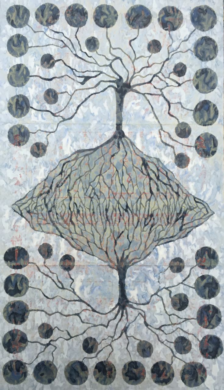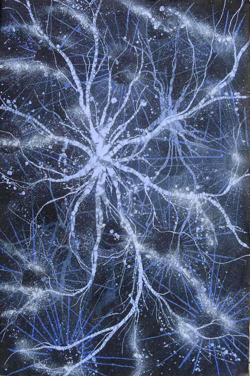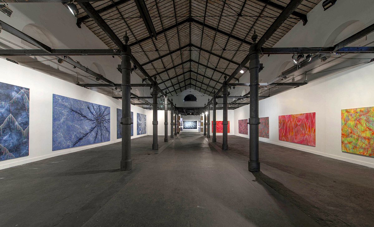 Alberto Di Fabio is taking inspiration from the world of natural sciences such as biology, chemistry and astronomy. His painting explores atoms, cell structures, neurons, DNA chains, constellations and galaxies giving life to shapes – often geometrical – in bright, pure colors that spin and vibrate all over his canvases, creating contrasts and harmonious scales, tonal variations and amazing juxtapositions, involving the observer in extrasensory kinetic experiences.