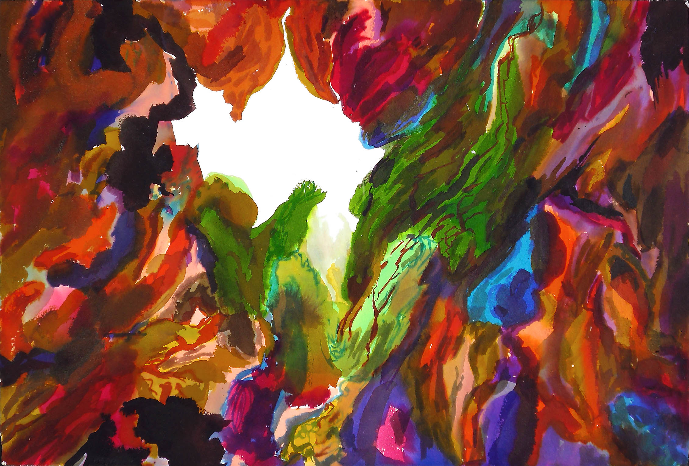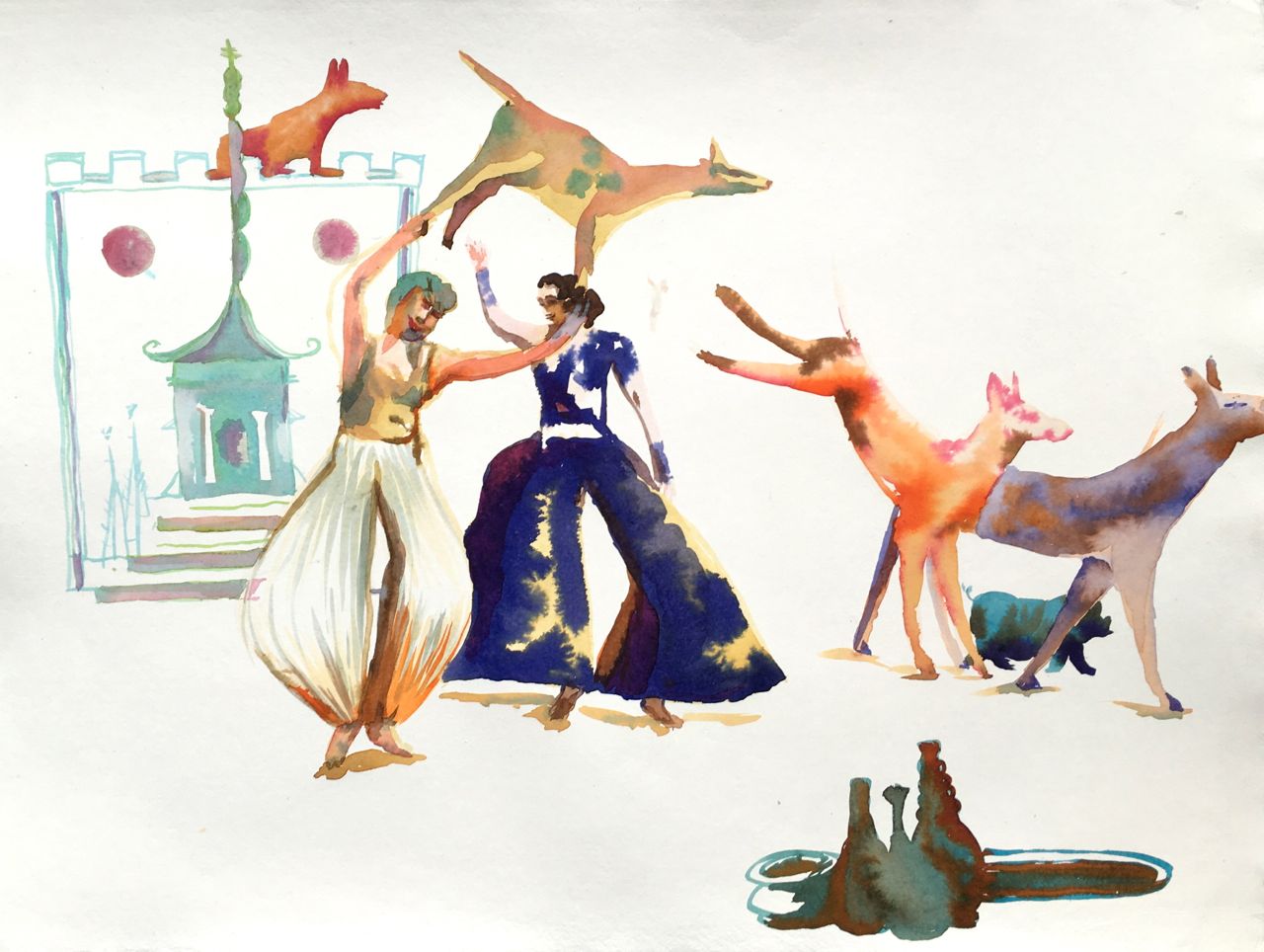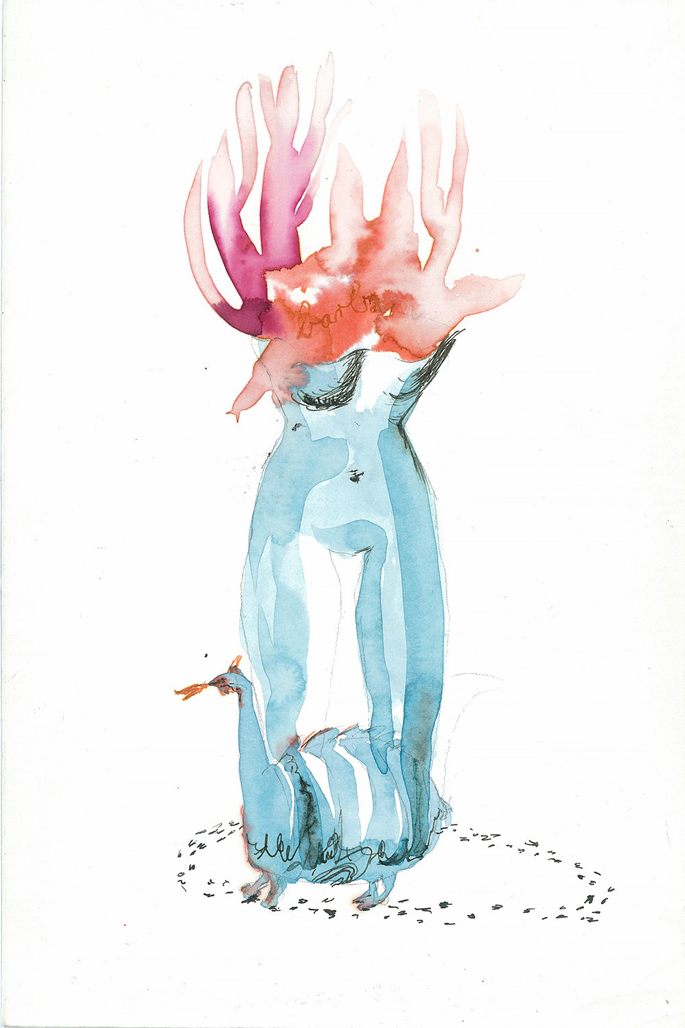 The strong narrative character in Elena von Hessen’s work is immediately visible. An important source of inspiration are her own dreams and personal experiences, which she is processing through various media, not only watercolours in luminous colours, but also murals, large scale intallations, performances and scultpture. Also illustrations of fairy tales and literature have influenced her work a lot, and she often seems to be creating a private universe by telling her very own stories in her pictures.