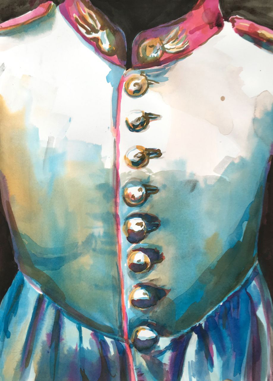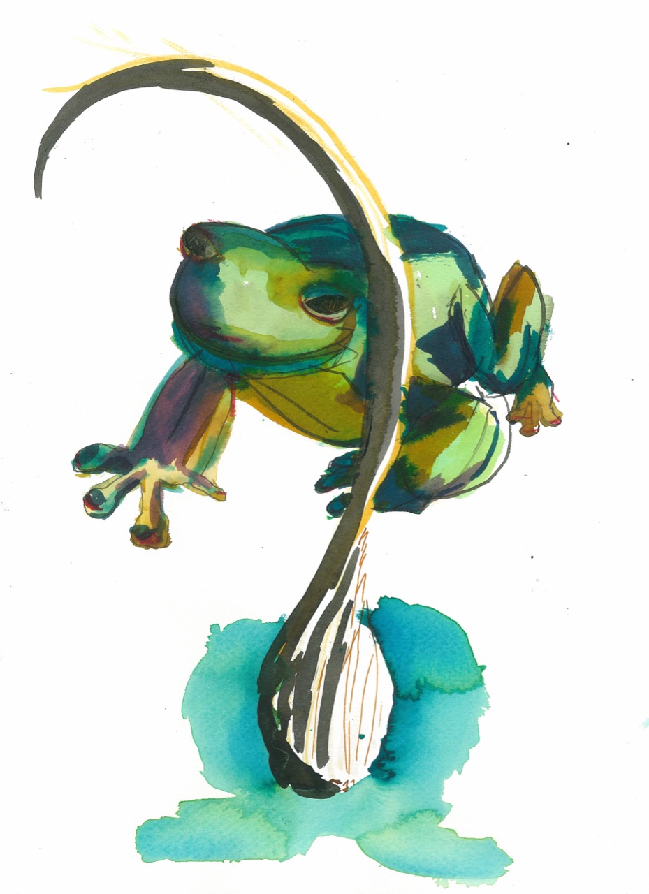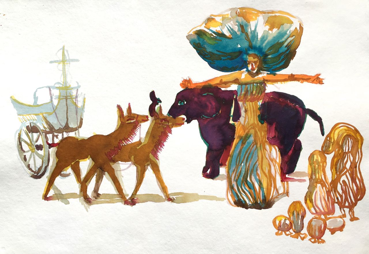 The strong narrative character in Elena von Hessen’s work is immediately visible. An important source of inspiration are her own dreams and personal experiences, which she is processing through various media, not only watercolours in luminous colours, but also murals, large scale intallations, performances and scultpture. Also illustrations of fairy tales and literature have influenced her work a lot, and she often seems to be creating a private universe by telling her very own stories in her pictures.